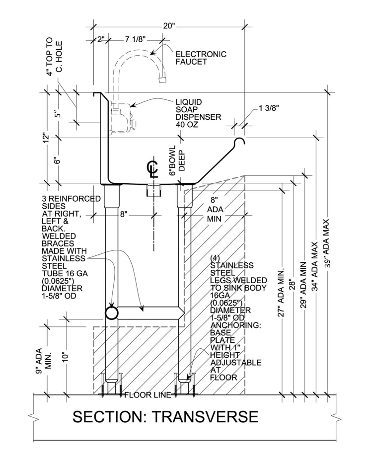 | 4 | Stainless Steel legs welded to sink body and braces, diameter 1-5/8" OD 16ga (0.0625") with adjustable floor plate 1" height, |