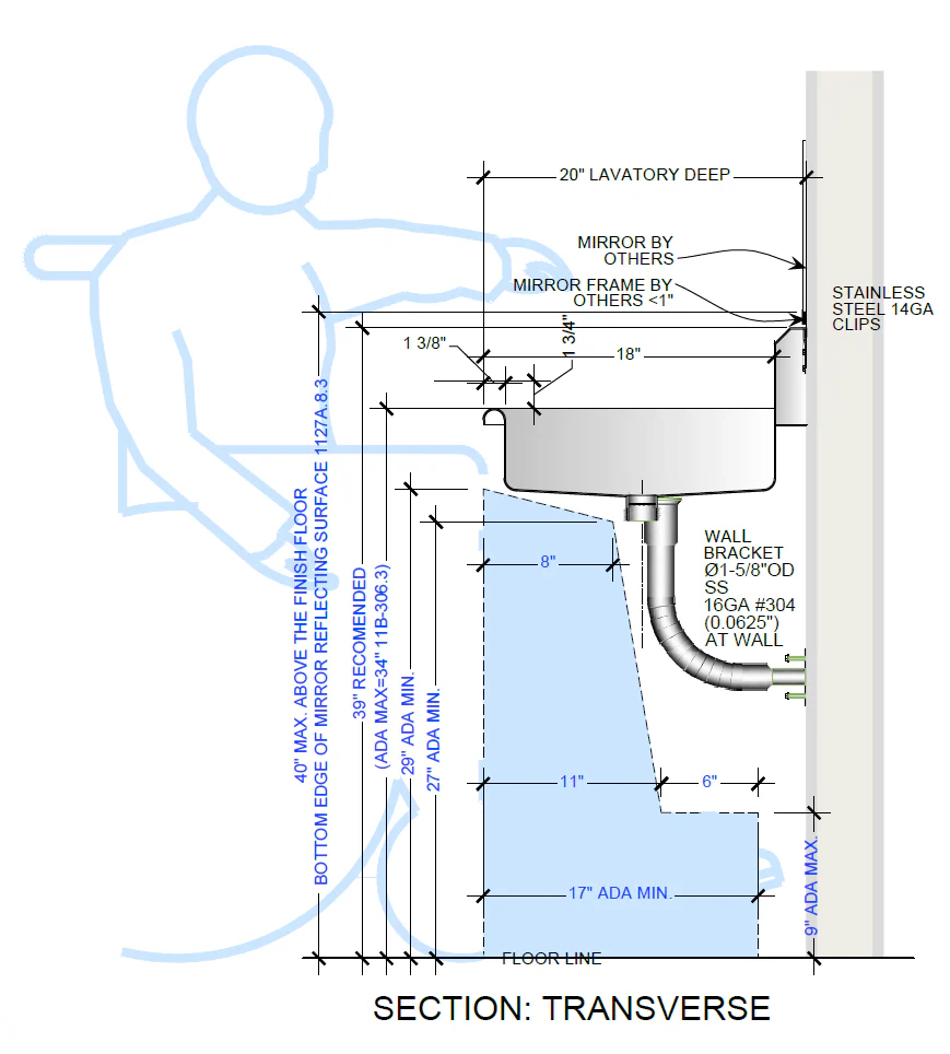 - With low profile backsplash for mirror ADA code 1127A.8.3.